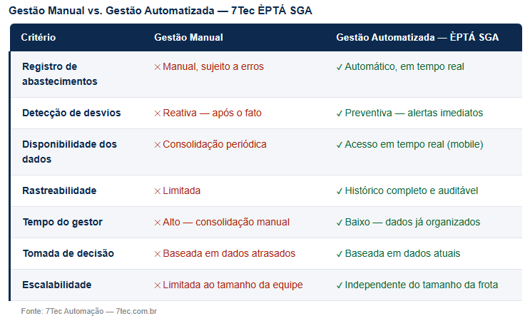 Sem um sistema que valide e registre cada abastecimento em tempo real, desvios podem se repetir por semanas antes de serem percebidos e quando são percebidos. Um abastecimento ligeiramente acima do volume esperado, repetido diariamente em uma frota de 30 veículos, representa uma perda considerável ao longo do mês. Na gestão manual, essa anomalia raramente chama atenção até que o prejuízo já seja significativo. - Tempo do gestor como recurso desperdiçado